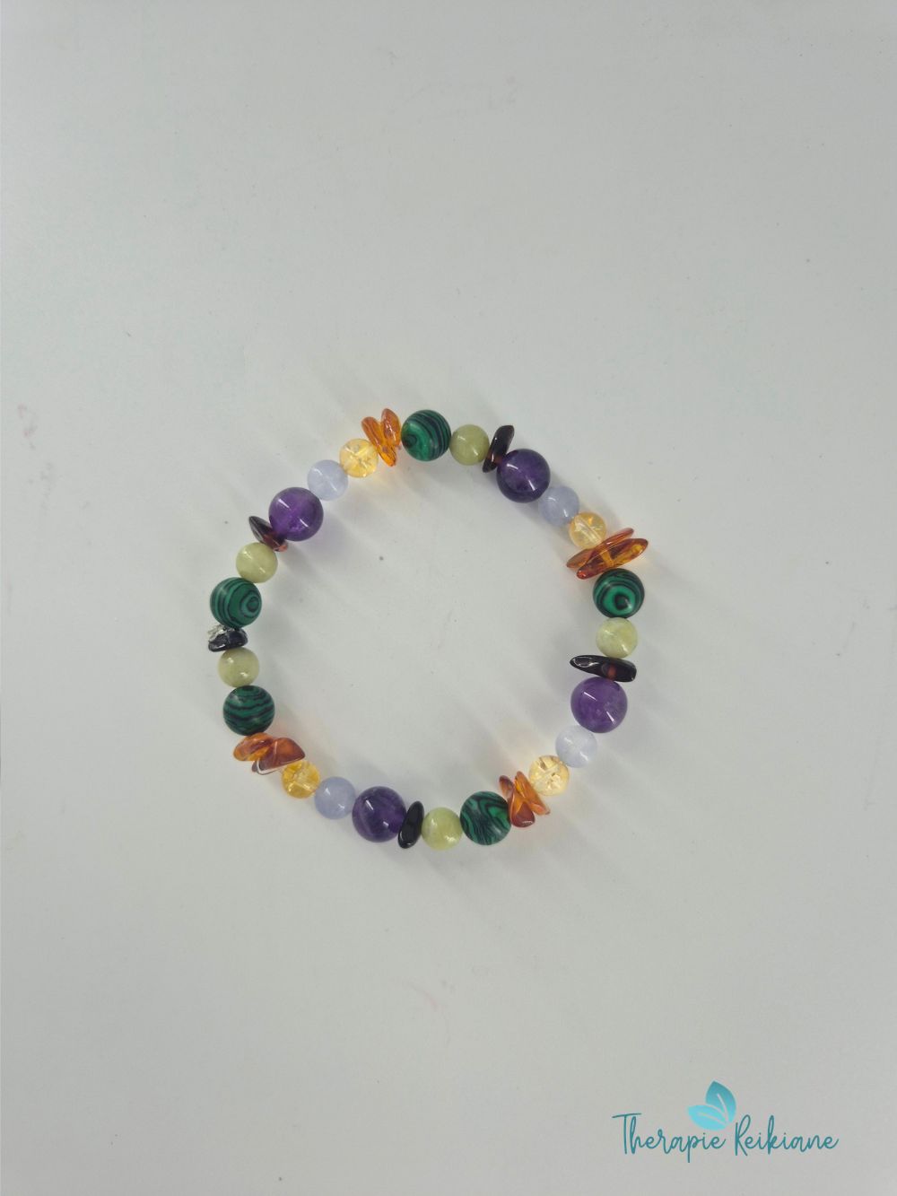 Bracelet de 19 cm de diamètre composé de plusieurs sphères et fragments. Il renferme les forces des pierres de protection, de santé et d’abondance.